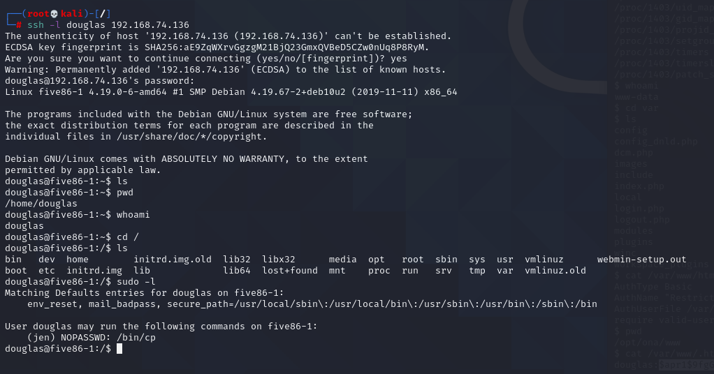 john --wordlist=/five86pass.txt /hash.txt目前已知douglas/fatherrrrr,结合前面的ona界面登陆入口和ssh账号进行尝试