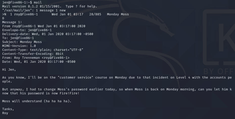 查看下邮件内容,在邮件里发现了moss账户的密码