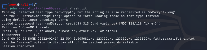 crunch 10 10 aefhrt -o /five86pass.txt再把刚才获得的hash写到一个新文本中,使用john工具进行破解