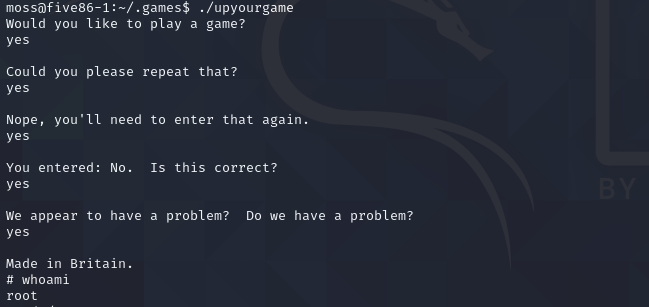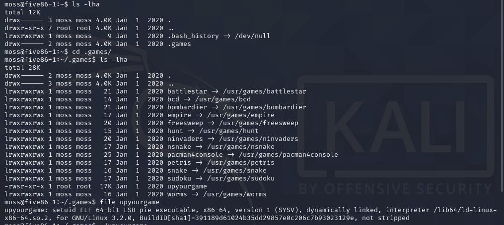 登录moss账户,发现有个games目录,进入后发现upyourgame为可执行程序