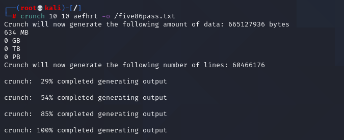 使用crunch生成最小10位,最大10位,由aefhrt6个字母组成的密码组合,并生成为xt文件
