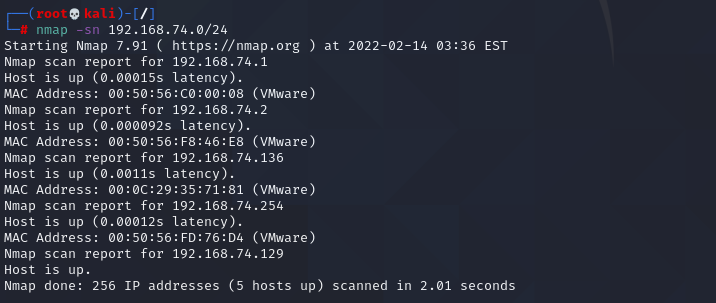 nmap -sn 192.168.74.0/24对目标ip做进一步的扫描
