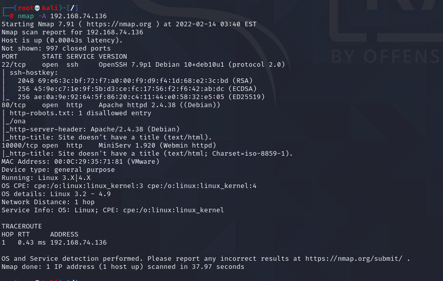 nmap -A 192.168.74.136从扫描信息中发现80端口的信息多一些,发现两个路径