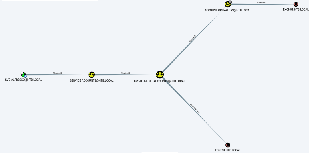 svc-alfresco这个用户是属于service account这个组的成员,同时它也是Privileged IT Accounts的成员,它也是account operators的成员。它允许该组的成员创建和修改用户并将其添加到不受保护的组那我们现在点击