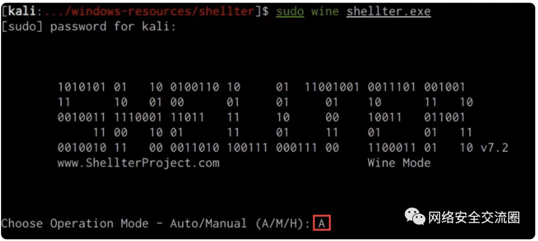 下一步将涉及启动Shellter并选择操作模式,在本例中,我们将使用自动模式。这可以通过指定“A”选项来完成,如下面的屏幕截图中突出显示的。