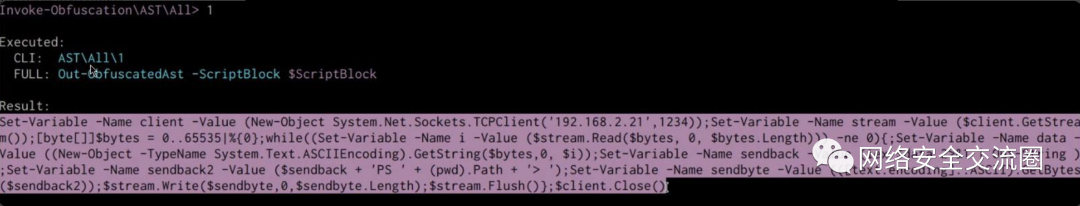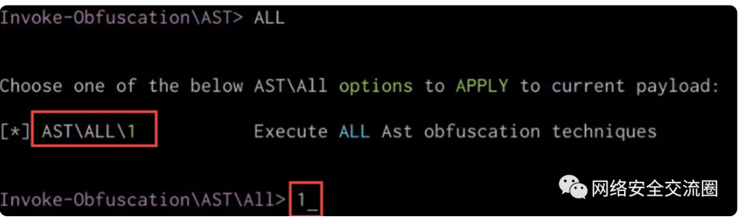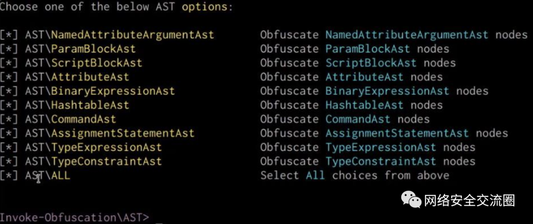 AST5、现在将提示您使用AST混淆选项,在本例中,我们将使用“ALL”选项。可以通过在Invoke-Obfuscate提示符下运行以下命令来选择此选项:
