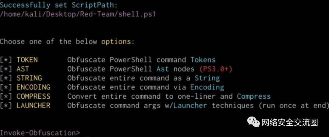SET SCRIPTPATH /PATH-TO-SCRIPT/script.ps13、指定脚本路径后,系统将提示您使用混淆方法菜单,如下面的屏幕截图所示。