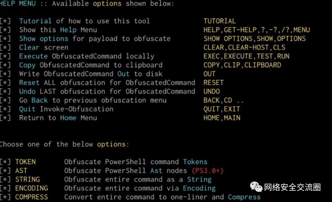 git clonehttps://github.com/danielbohannon/Invoke-Obfuscation.git .\Invoke-Obfuscation.ps15、如果您正确地遵循了前面的过程,那么Invoke-Obfuscation脚本将执行,并且您应该看到一个屏幕,如下面的屏幕截图所示。