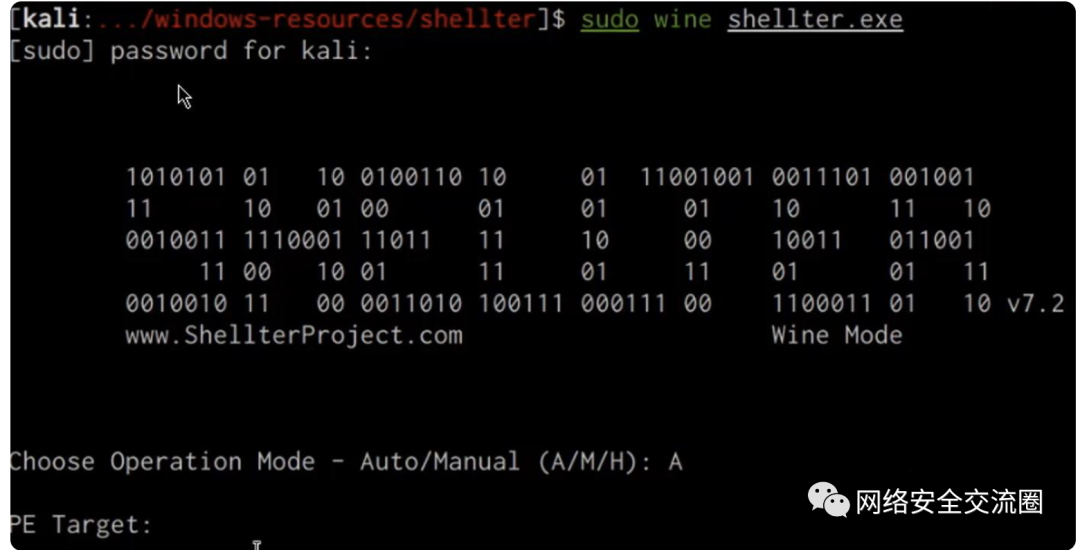 cd /usr/share/windows-resources/shellter/4、我们现在可以通过Wine运行Shellter来启动它,因为它是一个Windows PE。这可以通过运行以下命令来完成: