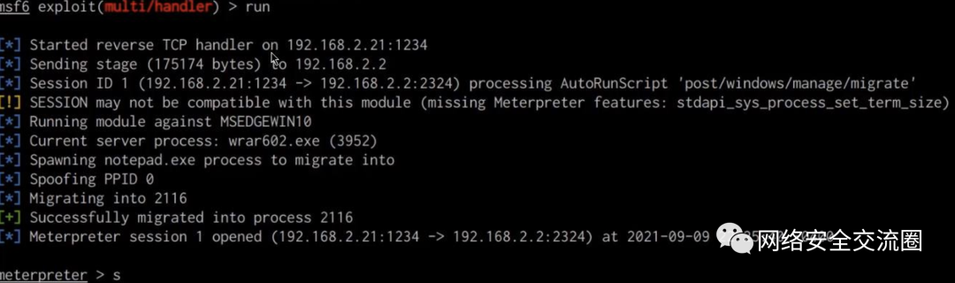 目标PE在目标系统上的执行未被AV检测到,因此,我们能够在目标系统上获得meterpreter会话。