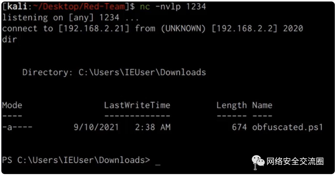 9、执行脚本不会引发任何AV检测/标志,并且我们能够在netcat侦听器上接收反向shell连接,如以下屏幕截图所示。