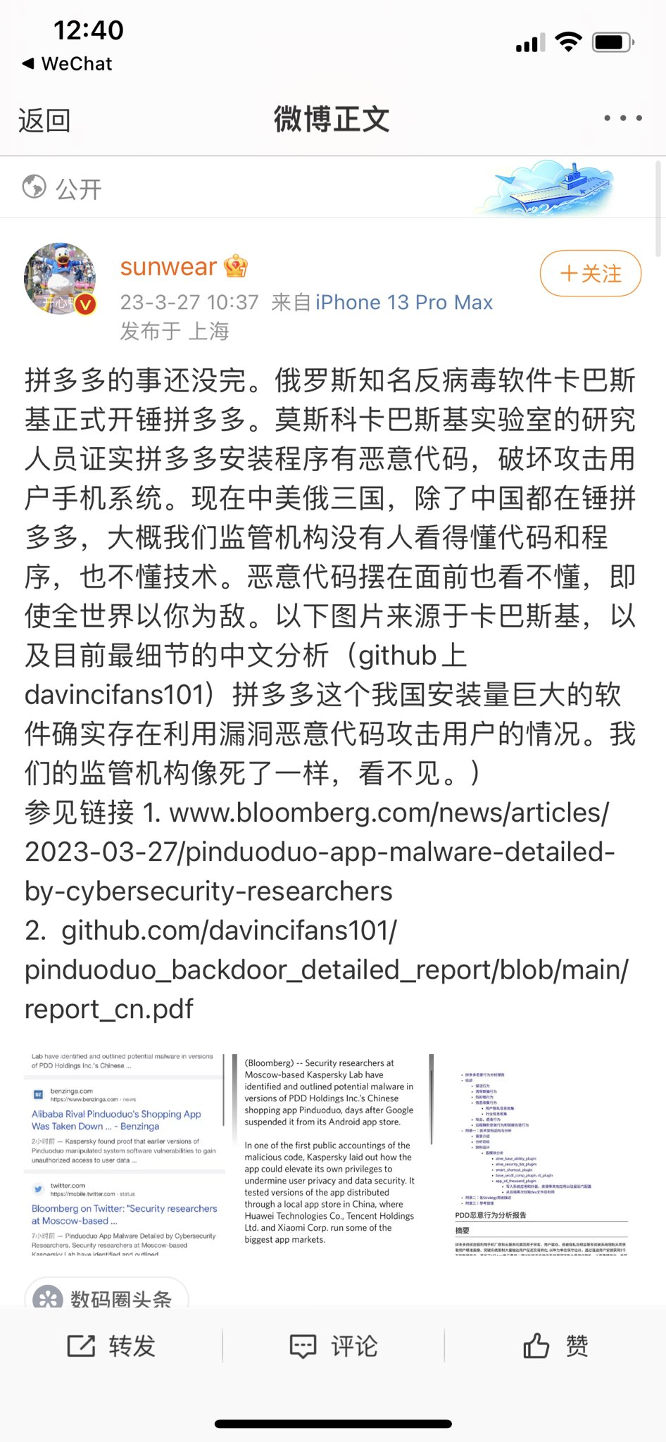 在对恶意代码的首批公开报告之一中,卡巴斯基阐述了该应用程序如何提升自身权限以破坏用户隐私和数据安全。它测试了通过中国本地应用商店分发的应用版本 —— 包含来自华为、腾讯和小米的应用市场。卡巴斯基与彭博社分享的调查结果是独立安全团队对上周触发谷歌行动和恶意软件警告的最清晰解释之一。这家网络安全公司在揭露历史上一些最大的网络攻击方面发挥了作用,该公司表示,它发现了早期版本的拼多多利用系统软件漏洞安装后门并获得对用户数据和通知的未授权访问的证据。这些结论在很大程度上与过去几周其他研究人员在网上发布的结论一致,尽管彭博新闻社尚未证实早期报道的真实性。网络安全专家 @sunwear 也发表了对此事的看法:除了卡巴斯基实验室,另外一家安全公司 Lookout 的研究人员对非 Google Play 版本的拼多多应用的分析也确认了独立安全研究机构 DarkNavy 的指控。初步分析显示,至少两个非 Play 版本的拼多多应用利用了漏洞 CVE-2023-20963。该漏洞是 Google 在 3 月 6 日公开的,利用该漏洞可以提权,而且整个过程不需要用户交互。两周前修复补丁才提供给终端用户。Lookout 的研究人员分析了拼多多在 3 月 5 日前发布的两个版本,都包含了利用 CVE-2023-20963 的代码。这两个版本都使用了与拼多多 Google Play 版本相同的密钥签名。目前没有证据表明 Play Store 和苹果 App Store 的版本含有恶意代码,但通过第三方市场下载的 Android 用户则没有那么幸运了,鉴于拼多多有数亿用户,受影响的用户数量可能是非常惊人。