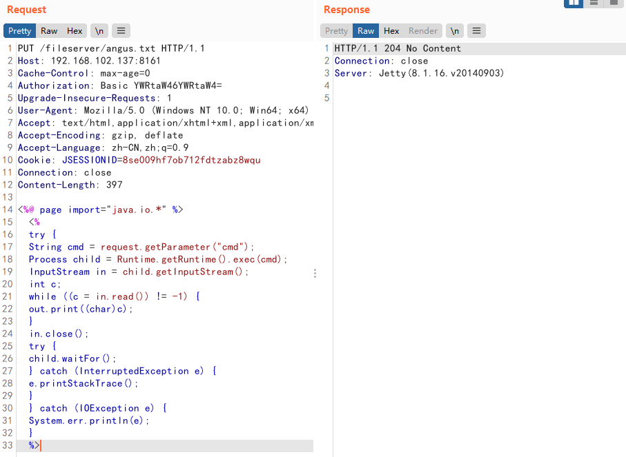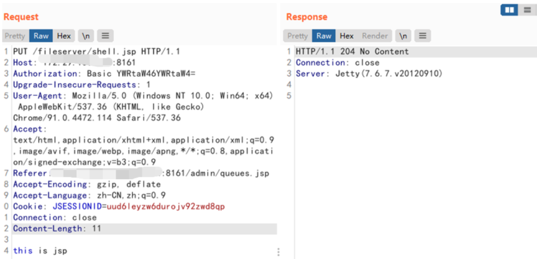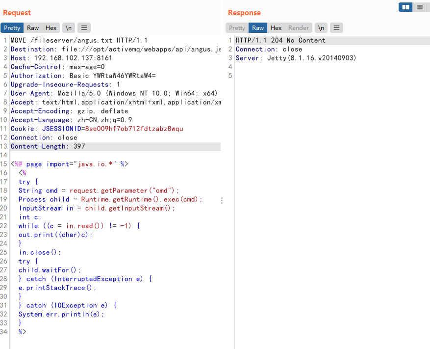 ActiveMQ开启put方法时,当fileserver存在时可上传webshell,一般构造成功返回204,若不可put则返回404或500,需要注意的是fileserver 路径下不解析,因为权限不足