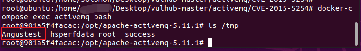 进入容器docker-compose exec activemq bash,可见/tmp/Angustest 已成功创建,说明漏洞利用成功