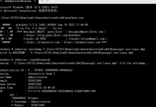 1、将编译后的文件放到目标靶机上以管理员身份运行,即可获得dump文件