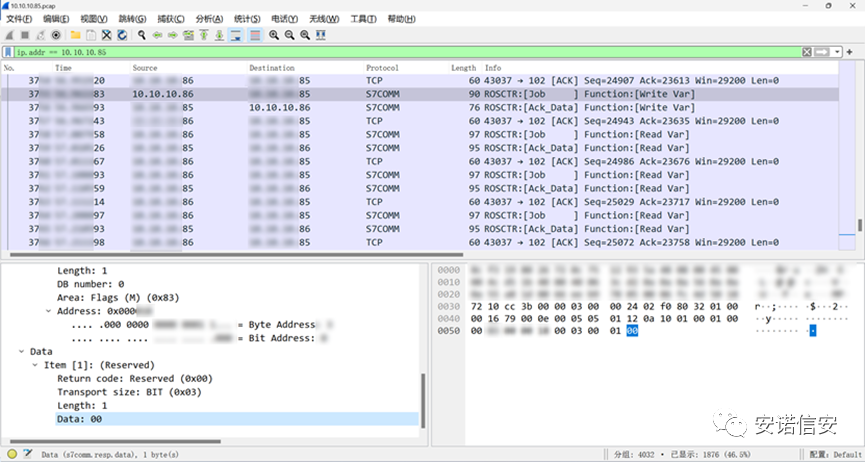 6、经过几周陆陆续续的抓包分析,发现有上位机与PLC通讯,且偶有一些写入PLC内存地址的操作,使用布尔值作为功能的开关变量,猜想可能为控制的某些功能;