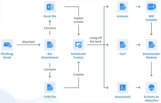 当 Excel 文档隐藏在下载的 RAR 附件中时,计划任务是通过利用打开恶意文档触发的较旧的公式编辑器漏洞来添加的。