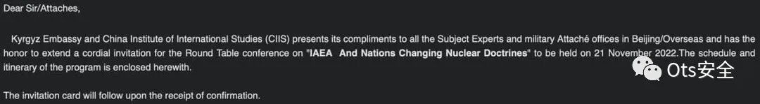 这封电子邮件假装是邀请参加一场据称由吉尔吉斯大使馆、国际原子能机构 (IAEA) 和我国国际问题研究院 (CIIS) 举办的核能会议。