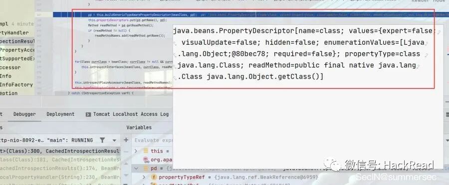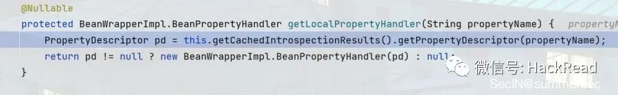 在getPropertyValue方法中调用getLocalPropertyHandler,由于getLocalPropertyHandler是抽象方法,会调用实现方法这里是BeanWrapperImpl.class类中的getLocalPropertyHandler方法。但BeanWrapperImpl是AbstractNestablePropertyAccessor的实现类,JavaBean存在内省(Introspection)机制,调用方法getLocalPropertyHandler之前会首先调用setIntrospectionClass方法。在方法getLocalPropertyHandler中,首先会调用getCachedIntrospectionResults方法,由于此时的BeanWrapperImpl中的CachedIntrospectionResults为null,因此会org.springframework.beans.CachedIntrospectionResults#forClass方法创建CachedIntrospectionResults对象。