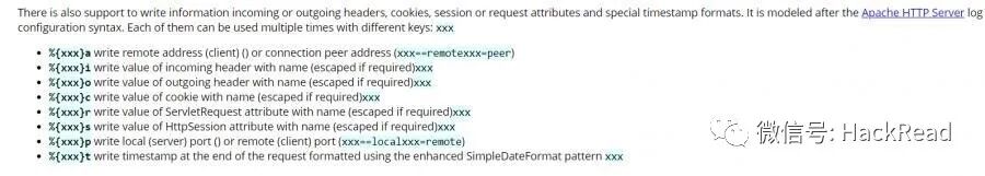 %{}i在payload中有这个格式,查阅tomcat相关资料可以发现这里的 %{}i是以 Apache HTTP 服务器日志配置语法为模型,支持写入传入或传出标头,Cookie,会话或请求属性以及特殊时间戳格式的信息。