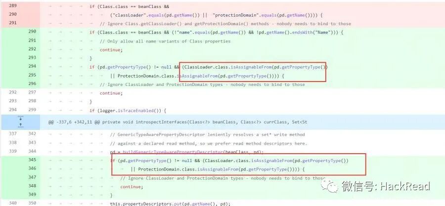 临时性修复方案,首先来看代码,将 {"class.*","Class.*","*.class.*","*.Class.*"}字符串数组加入黑名单,这样子使用大小写无法绕过。但为什么要调用WebDataBinder#setDisallowedFields方法呢?
