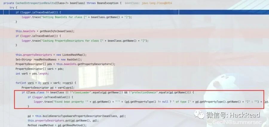 在CachedIntrospectionResults类中的构造器方法,存在前面历史漏洞的修复方案。但自从Java9加入module机制之后,此修复方案就可以被绕过了。