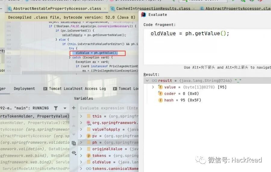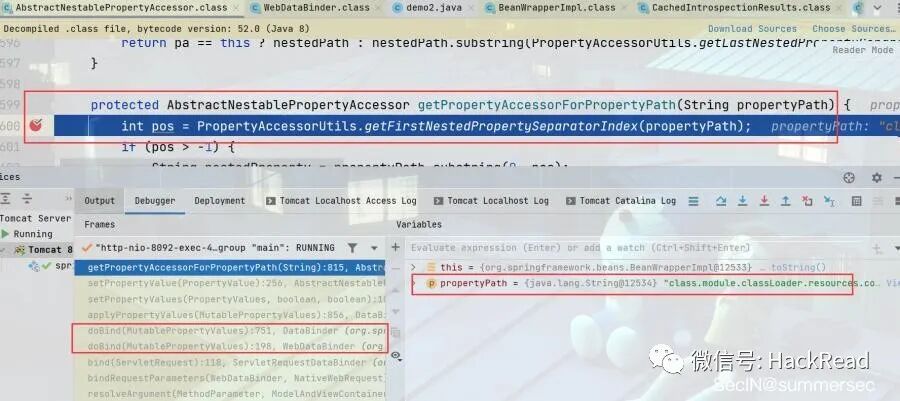 在 org.springframework.beans.PropertyAccessorUtils#getNestedPropertySeparatorIndex中,这段代码作用获取 .的位置,然后返回位置。在以 .为分割线,取字符串,首先会取class字符串,在依次module、classloader..。nestedPath是记录分割之后的字符串,nestedProperty是记录分割出来的字符串,传入getNestedPropertyAccessor方法之中。