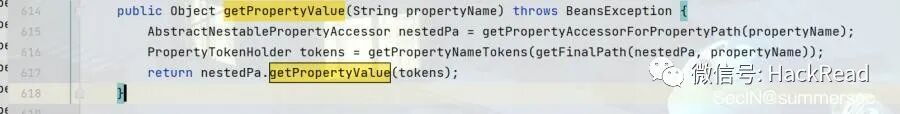 首次进入getNestedPropertyAccessor方法会创建一个hashmap,然后调用getPropertyValue方法。