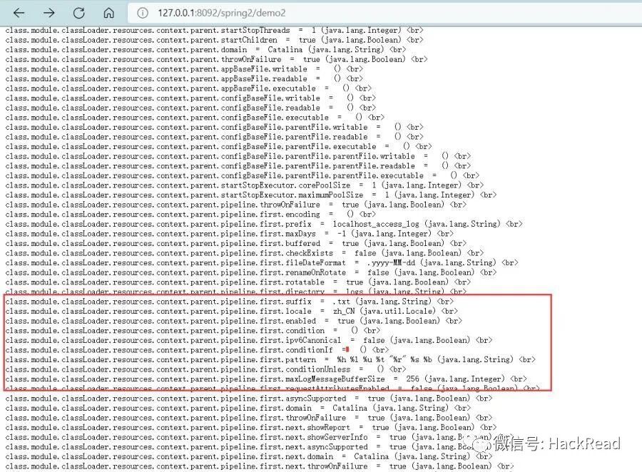 从这里可以很轻松的看懂为什么class.module.classLoader.resources.context.parent.pipeline.first.suffix构造,下面另一张图可以找到一些可利用的gadget。