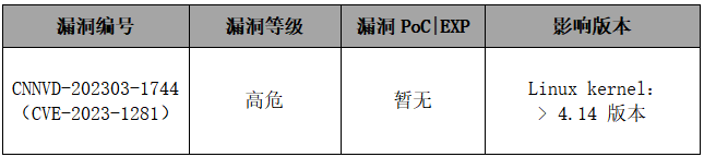 近日,嘉诚安全监测到Linux官方发布了Linux kernel 权限提升漏洞的安全风险通告,漏洞编号为:CNNVD-202303-1744(CVE-2023-1281)。