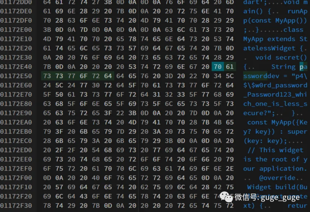 grep/findstrMyApp()而如果某公司希望对他们的APP程序中再次进行一次黑盒渗透测试,并且这一次他们使用了Release 模式,使 Dart 内核字节码不再存放在应用程序的assets文件夹中怎么办? Dart 源代码本身并不会出现在应用程序的 JVM 包中,因此我们将在第二篇文章中从静态和动态的底层视角进行深入分析。