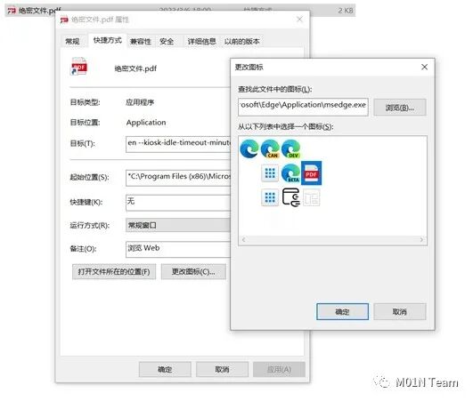 众所周知,lnk文件可以带参数运行指定程序,在起始位置选择Edge浏览器的绝对路径,目标填入kiosk模式的命令行参数,加上必要参数避免首次启动引导和无法退出,利用lnk文件特性,可以构造诱导性后缀名、选择诱导性的图标,构造如下:
