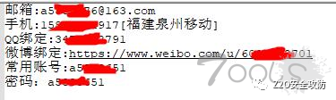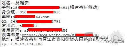然后把这个手机号丢到了sgk查询了一下,发现一个163邮箱,通过这个163邮箱再查到几个已经泄露的密码(这东西我就不截图了,看下面整理出来的信息就行)