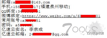 然后配合reg007搜索手机号和已知的邮箱,试试撞库,运气不错,就这两个网站大部分网站都可以登陆,在亿速云发现一个名字和一个邮箱,现在这个名字是没办法确认是否是他本人的,必须拿出有力的证据来证明才行,邮箱和名字就先放着