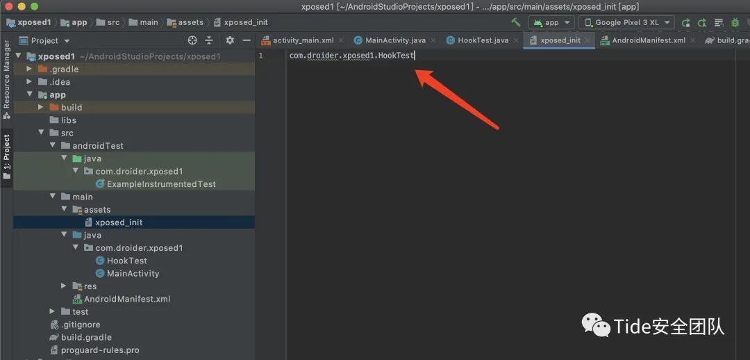 然后右键点击assets文件夹, new--> file,文件名为xposed_init(文件类型选text),并在其中写上入口类的完整路径自己编写的Hook类,这样Xposed框架就能够从这个 xposed_init 读取信息来找到模块的入口,然后进行Hook操作。