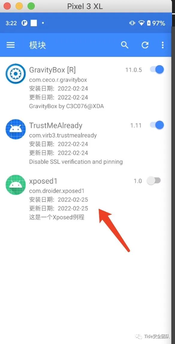 输入代码后,将测试手机连上AndroidStudio ,点击“运行”手机就会启动刚刚编写的这个程序。手机里的Xposed框架中也会显示出这个模块: